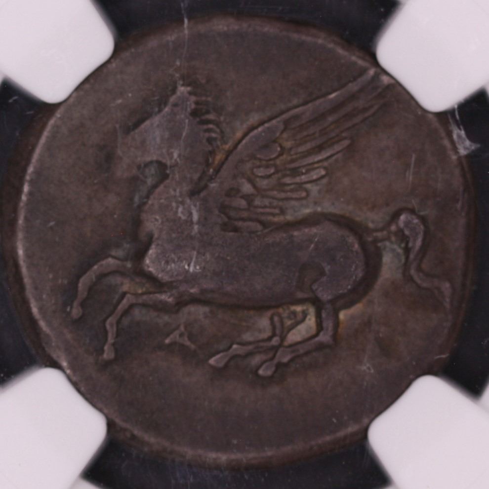NGC VF, Strike 3/5 Surface 4/5. Ex Goldberg C&C Auction 96, lot #1639. Pegasi-33 (same dies); BCD Akarnania-138. Obverse: A below, Pegasos flying left; Reverse: AM?I above, head of Athena left, wearing Corinthian helmet; in right field, ABP and spear. Beautiful golden and green toning is hidden under a deep layer of dark grey color. The fine-style portrait of Athena only enhances the beauty of the specimen. Save for a weak strike on the obverse pegasus, this coin is a perfect example of the type that will compliment any set.