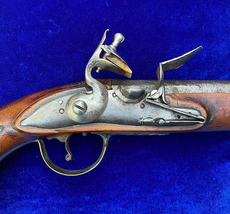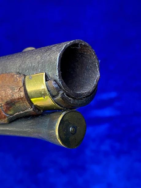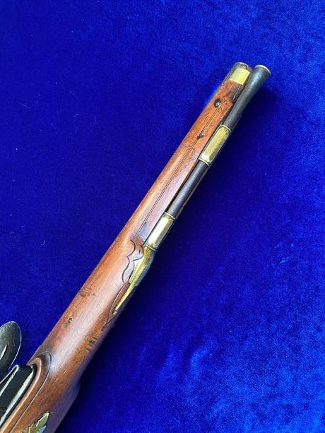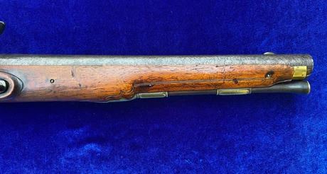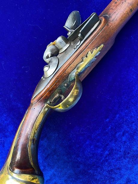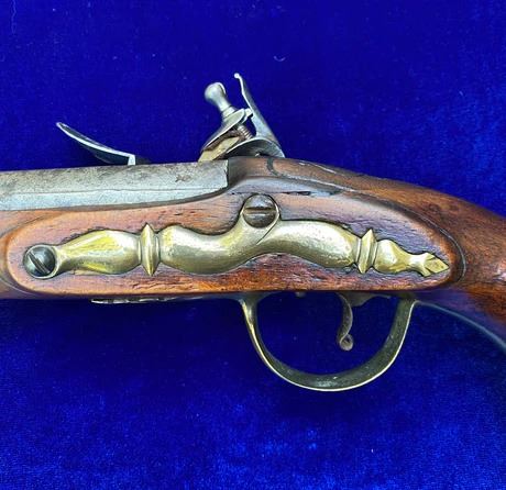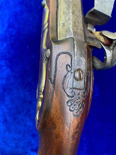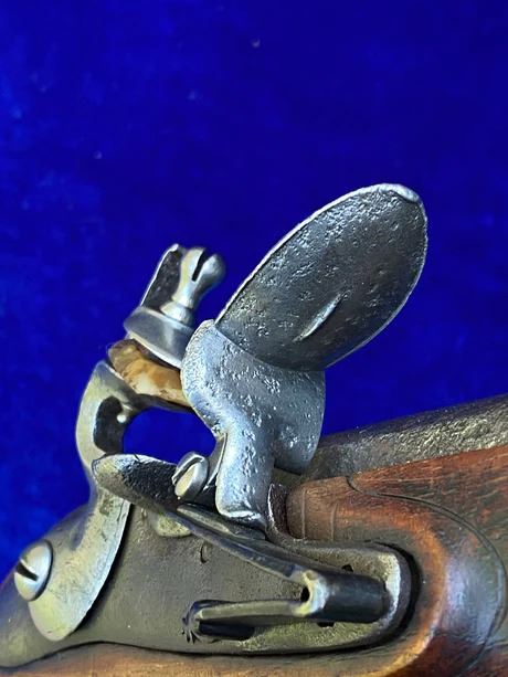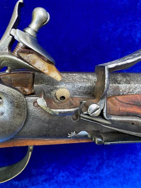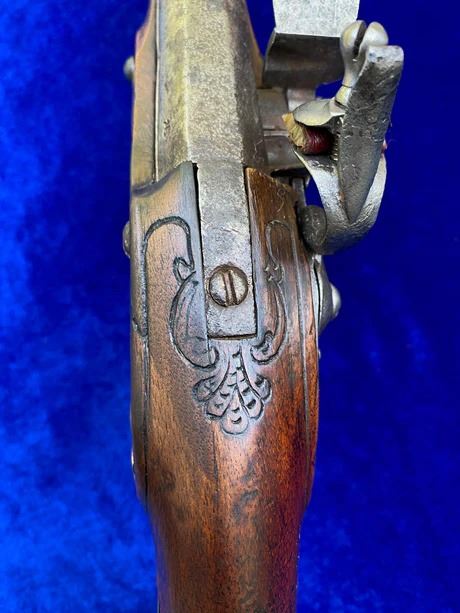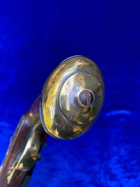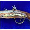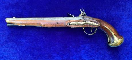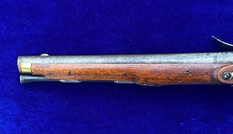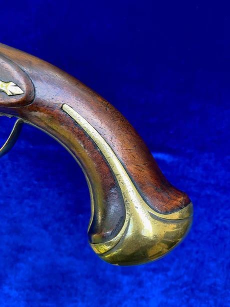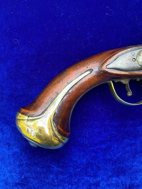 RESTORATION NOTES: This pistol has been restored (reconverted back to the flintlock configuration). The barrel's touch hole has been restored with a brass bushing. The lock has been restored utilizing original period parts. The stock has wood restoration on the left side of the barrel tang and has simple incised decorative carving.