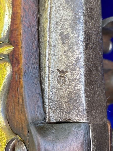 A Very Interesting Massive Antique European (possibly Dutch or German ?) Flintlock Holster Pistol, c. 1740-1770. 13", .67 caliber smooth-bore steel octagon-to-round barrel struck on the left flat of the breech with an unidentified "PROOF" mark. The barrel's touch hole has been restored with a brass bushing. Heavy all brass furniture. The convex banana shaped lock is unmarked. The stock has wood restoration on the left side of the barrel tang and has simple incised decorative carving. The overall stock is solid with scratches and dings from years of handling. All steel parts have salt & pepper rust pitting. Wood ram rod with a flat brass tip. Measures 20.25" overall. This pistol may have seen action in the French & Indian War - American Revolutionary War and is in good mechanical working order. A huge flintlock pistol !!!
