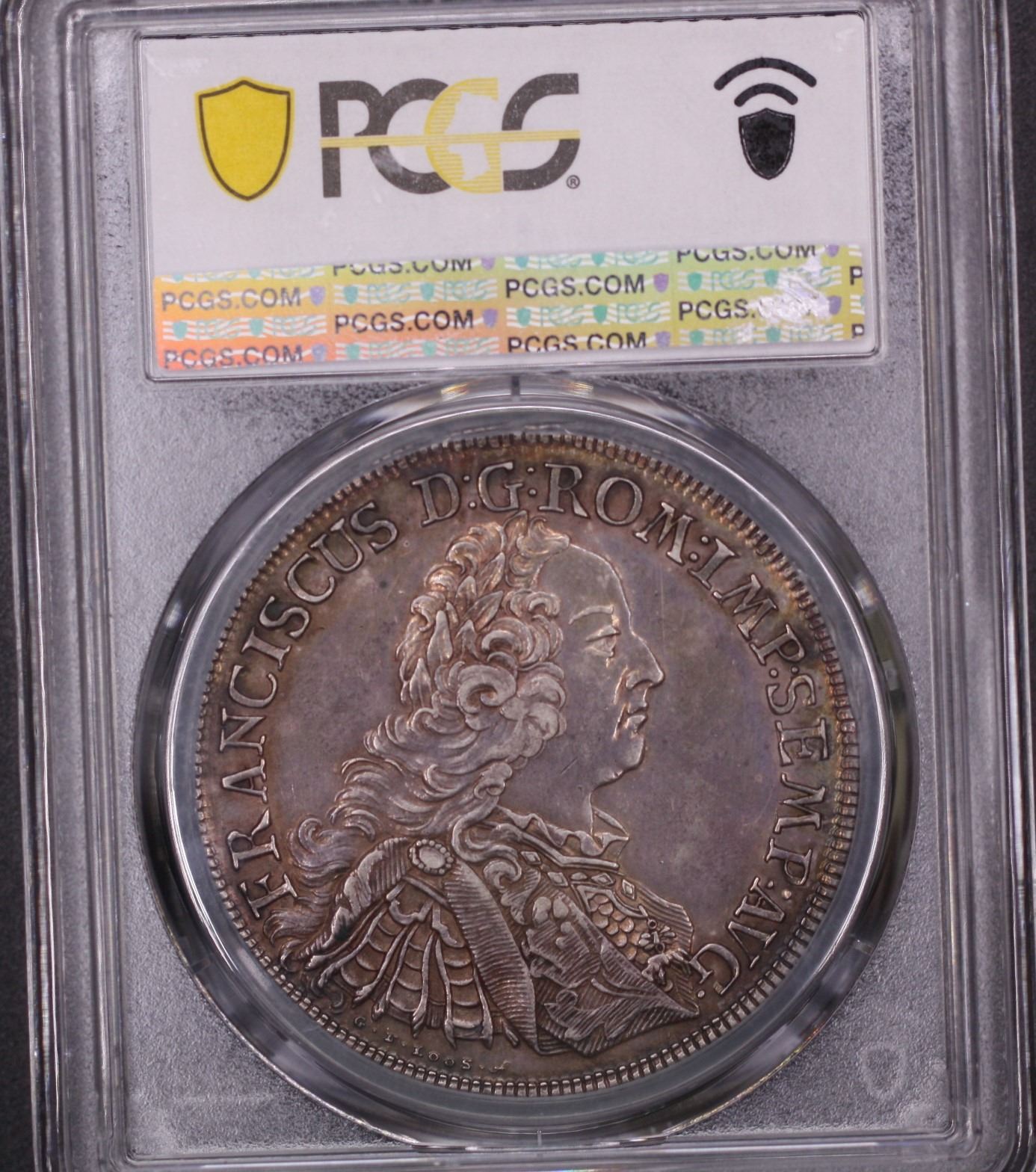 Francis I. PCGS AU-53. Dav-2618; KM-372. A gorgeous and eye pleasing Taler featuring the city view of Regensburg. A perfectly circulated specimen that without a doubt has been well taken care of. An underlying cabinet tone and golden hues around the leettering make this piece an essential addition to any Taler collection. The Taler was deigned by Loos, who is famous for designing many other medals such as many baptismal medals.
