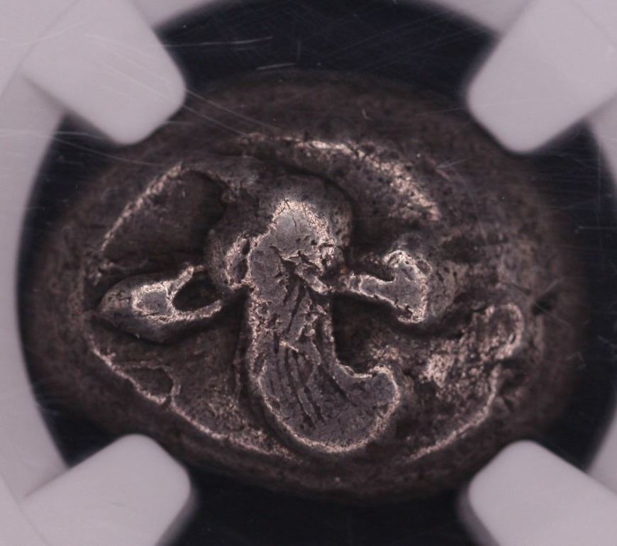 7.80 gms. Mavrogordato-19; HGC-6, 1118. Obverse: Sphinx seated left; amphora to left; Reverse: Quadripartite incuse square. An exceptionally RARE example that is perfectly circulated and struck. A pleasant patina surrounds the entire coin, allowing the details to be viewed in the greatest detail. The coin is completely problem free and is only hindered by a weak strike on the obverse.