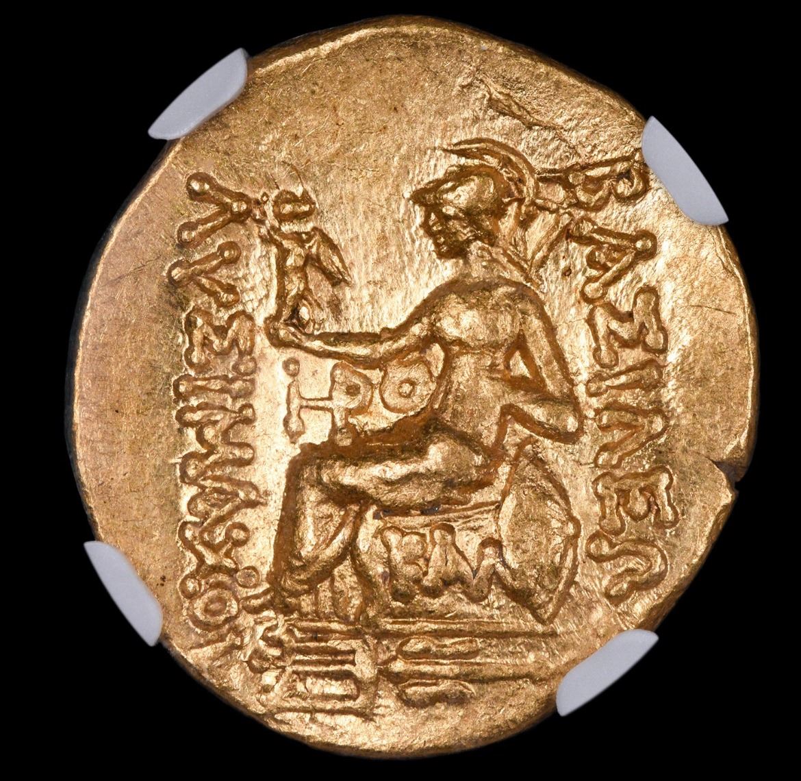Mithradates VI Eupator. 120-63 (88-86) BC. AV Stater, Kallatis mint. Diademed head of the deified Alexander right, wearing the horn of Ammon / Athena Nikephoros seated left; HPO to inner left, KAΛ on throne, trident below. Callataÿ p. 140, obv. die D6. Die rust.