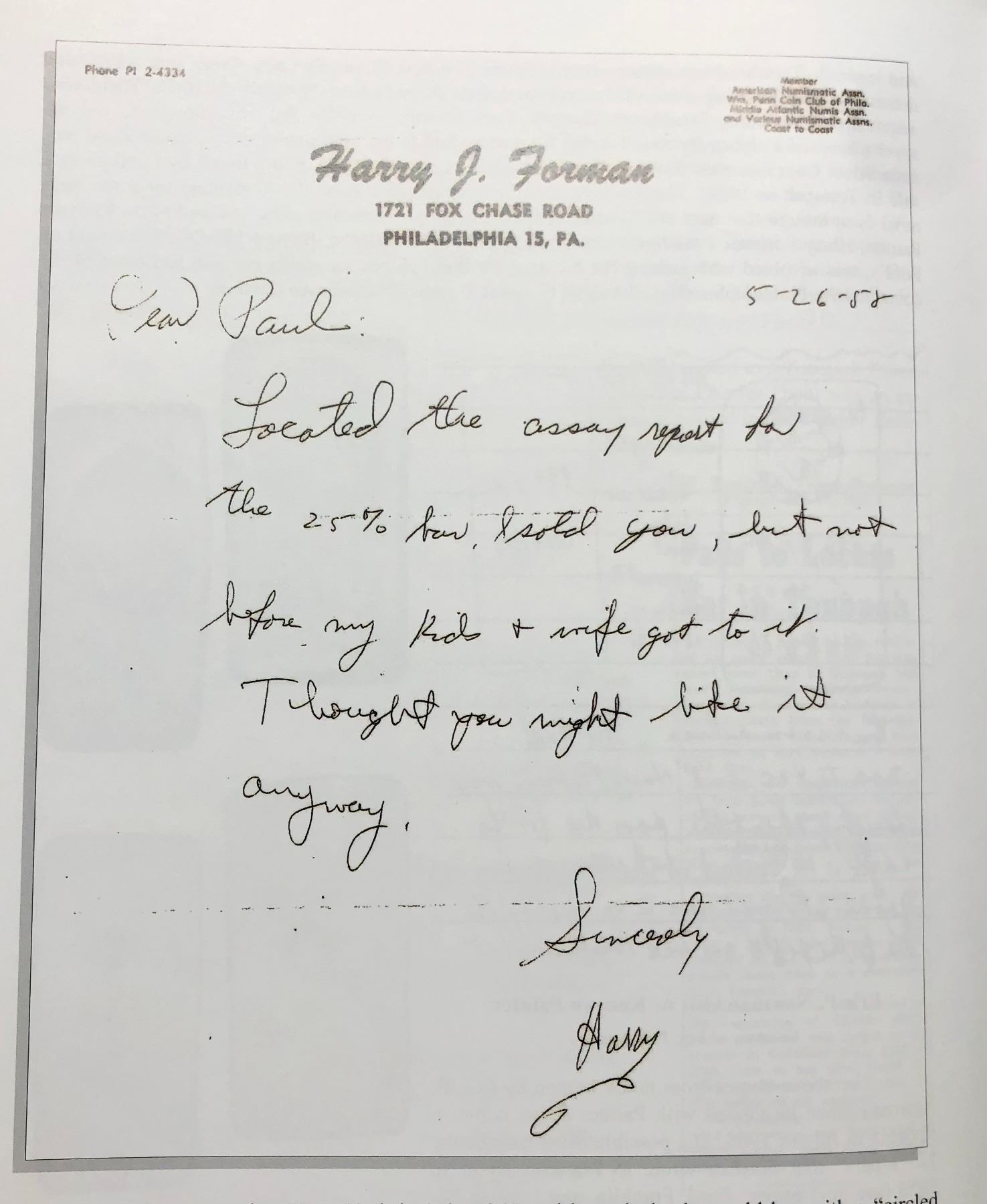 Within the Franklin Hoard listed as plate 15 on page 191 in Moulton’s publication John J. Ford, Jr. and the “Franklin Hoard” are examples of the Eagle Mining Company pieces also attributed to the Franklin Hoard. These generally were Silver with a few gold examples which all are extremely rare with the 1878 Eagle Mining Company $124 gold specimen which is shown in Moulton’s publication courtesy of the Smithsonian Institute. This, Nevada Silver Company Franklin Hoard piece to our knowledge is an undiscovered gold specimen of equivalence to the gold Eagle Mining Company specimens. The estimated production date of the Gold Nevada Silver Company specimen is estimated as 1955-1958 with the intention of appearing to have been produced in the 1870-1890 range. On page 261 of from notes written by Eric P. Newman when he visited Kenyon Painter at his home in Phoenix in July of 1968 John J. Ford, Jr. and The “Franklin Hoard” by Karl B. Moulton It shows sketches of the Nevada Silver Company Die workup and records that show the origins and also that the Nevada Silver Company die was contracted through Harry J. Forman a long time Philadelphia coin dealer whom for many years was Madison mint (of Silver Art Bar Collectable fame.)