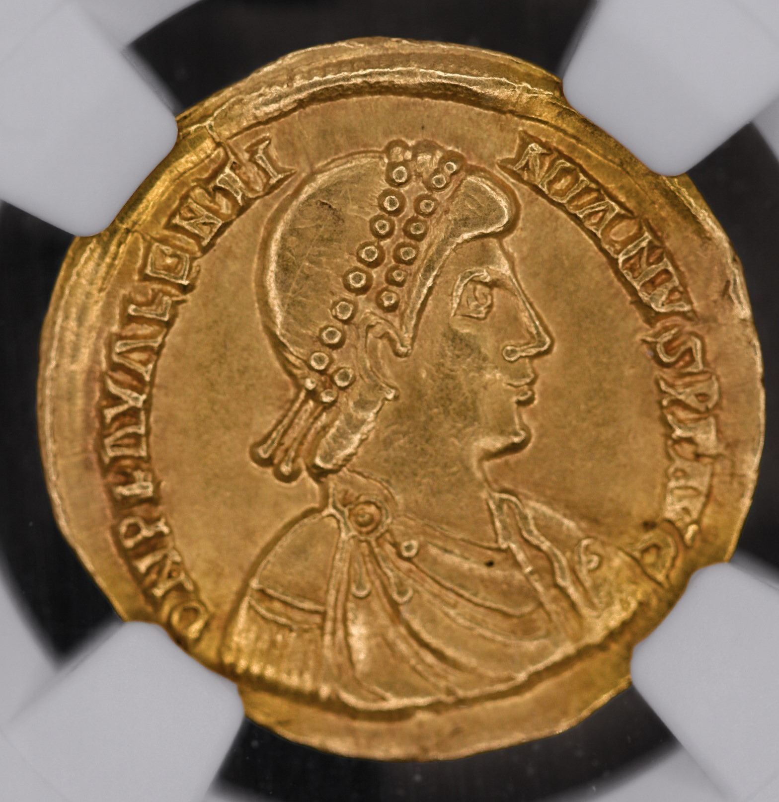 Visigoths, Gaul. Uncertain king. 425-455 AD. AV Solidus. Struck in the name of Valentinian III. Pearl diademed, draped, and cuirassed bust right / Valentinian standing facing, with foot on human-headed serpent, holding long cross and crowning Victory. Similar to CNG 72, lot 2231.